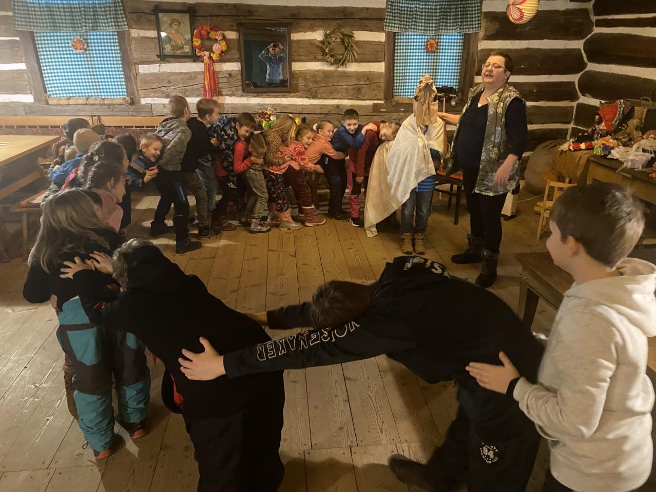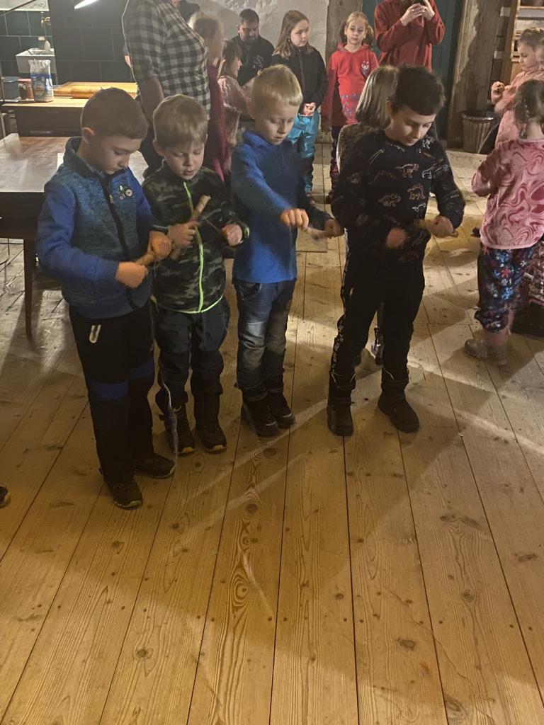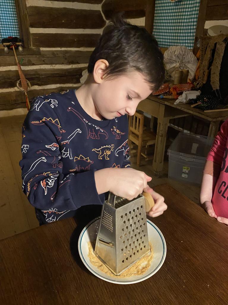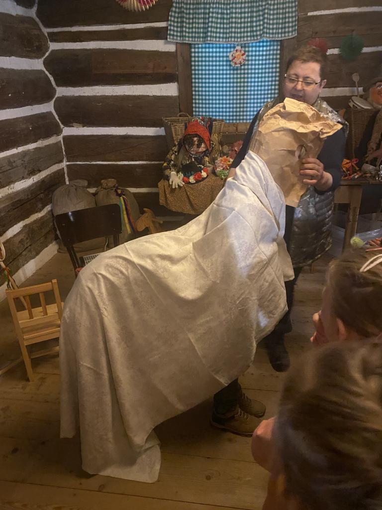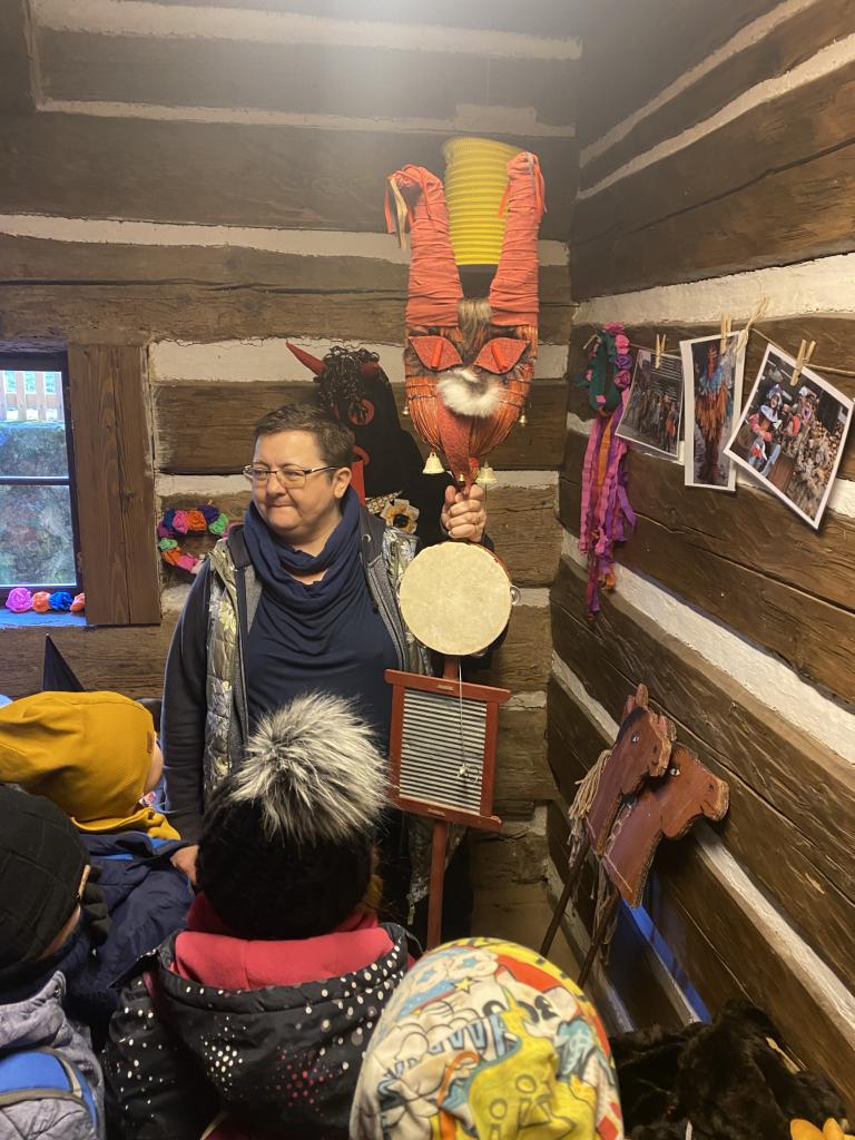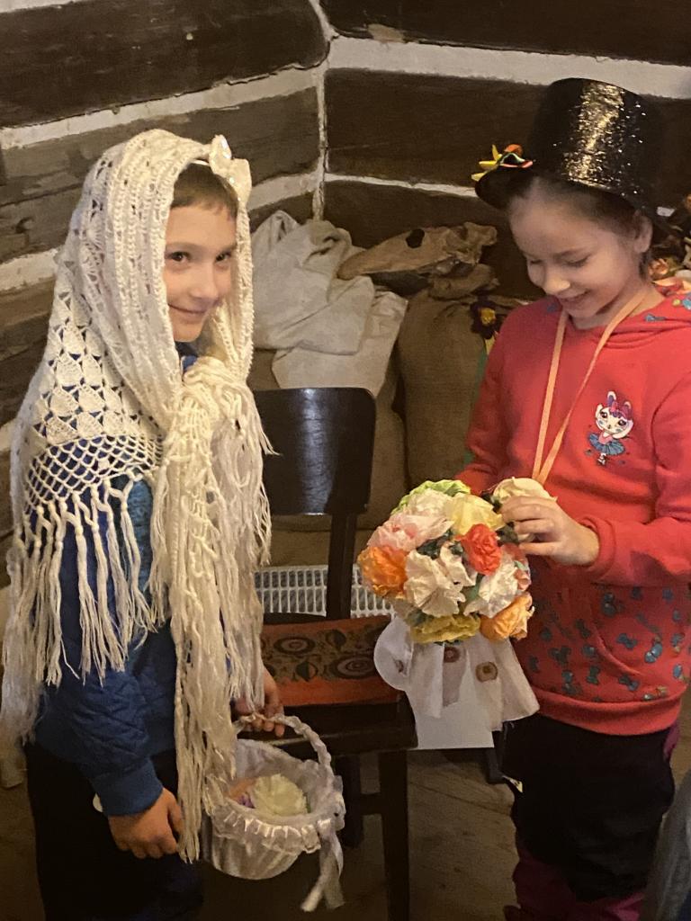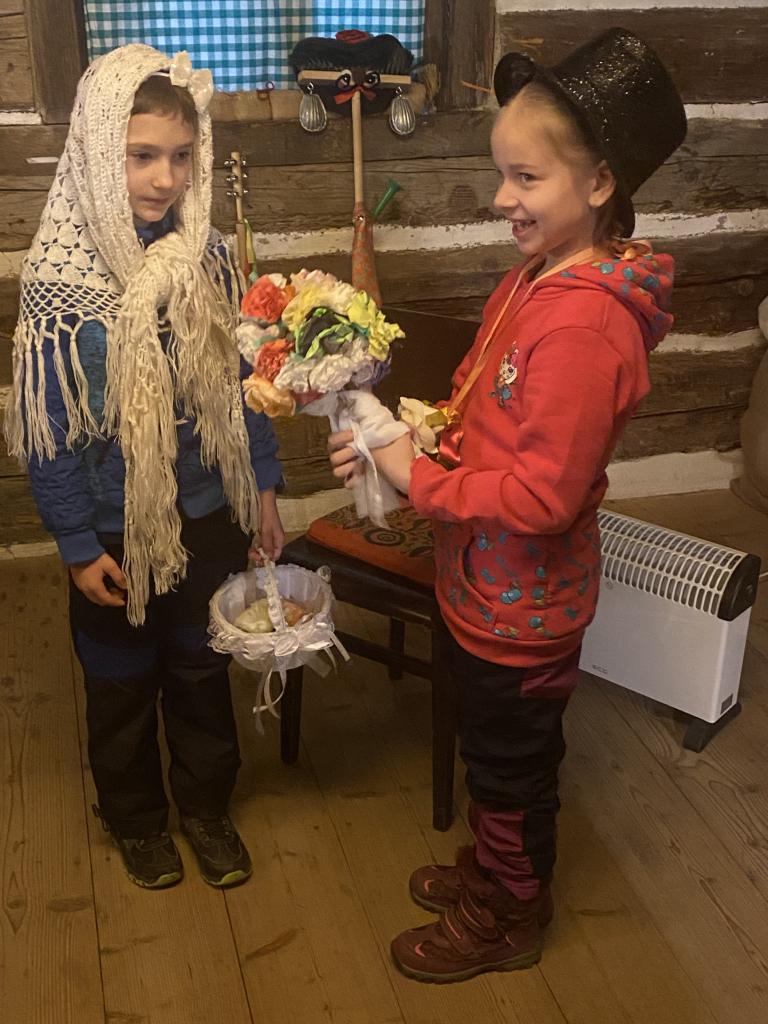 Teta Lenka, Šárka a Petra se věnovala každé skupince, takže děti vyráběly ferule, masku a upekly si vynikající mrkvánky s muzikou. Některé děti poprvé ochutnaly chleba se sádlem. Dobrovolníci zahráli masopustní svatbu, kdy chlapec představoval nevěstu a dívka ženicha. Na závěr si všichni zazpívali píseň s vozembouchem a prohlídli si výstavu masek v prvním patře. Děkujeme obětavým tetám, které stále udržují a předávají naše krásné tradice, které už pomalu mizí.