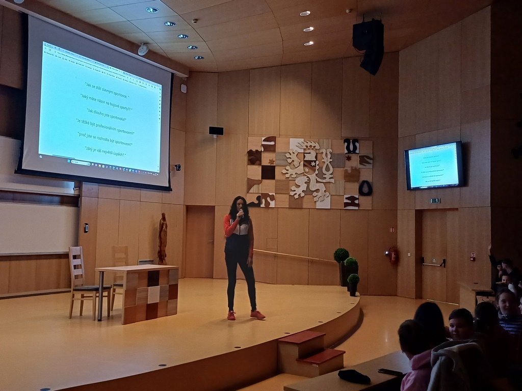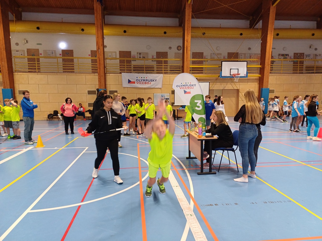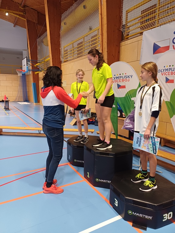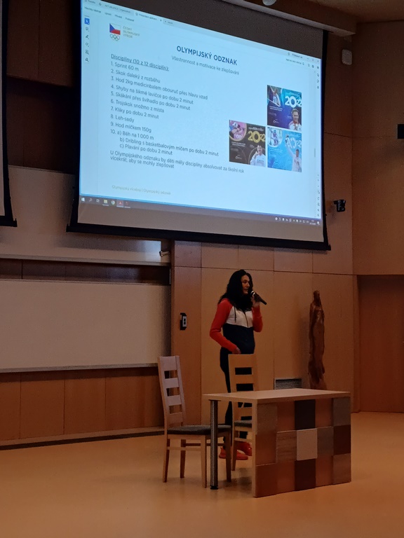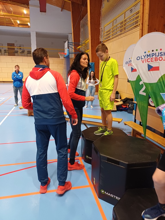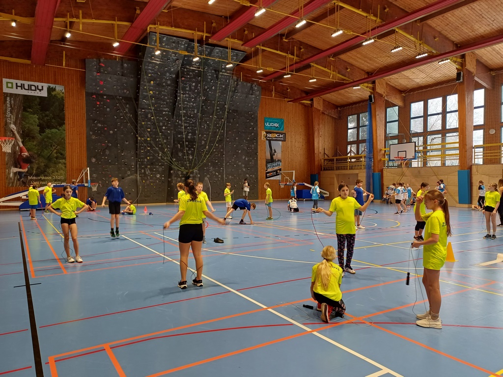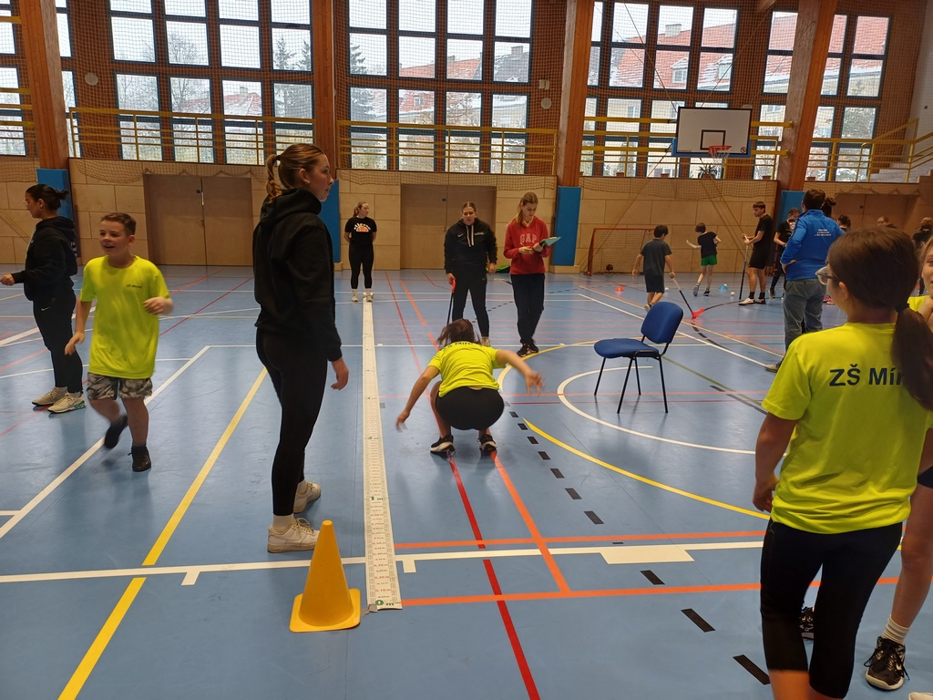 ejprve se šesťáci, studenti oboru učitelství TV a pořadatelé akce sešli v aule k teoretické části, kde byl projekt představen. Šárka Kašpárková (3. na OH v Atlantě v roce 1996 a 1. na MS v Aténách v roce 1997 v trojskoku) se podělila o svojí sportovní kariéru a zodpověděla mnoho zvídavých dotazů. Pak se všichni přesunuli do sportovní haly, kde byla společná rozcvička se švihadly a 4 stanoviště ke sportování. Naše škola začínala na bonusovém stanovišti, kde si žáci mohli změřit rychlost střely florbalovým míčkem, zkoušeli přesnost trefy do otvorů na florbalové brance a zasoutěžili si v rychlosti reakce na reakčních světlech. Následovaly tři soutěžní stanoviště, a to člunkový běh 4x 10 metrů, trojskok a hod medicinbalem. Výkony z těchto disciplín byly převedeny na body a na závěr bylo vyhlašování těch nejlepších. A naši šesťáci se rozhodně neztratili, domů si odvezli 3 vítězství ve svých kategoriích a další 4 umístění na stupních vítězů. Gratulujeme a všem děkujeme za vzornou reprezentaci školy.