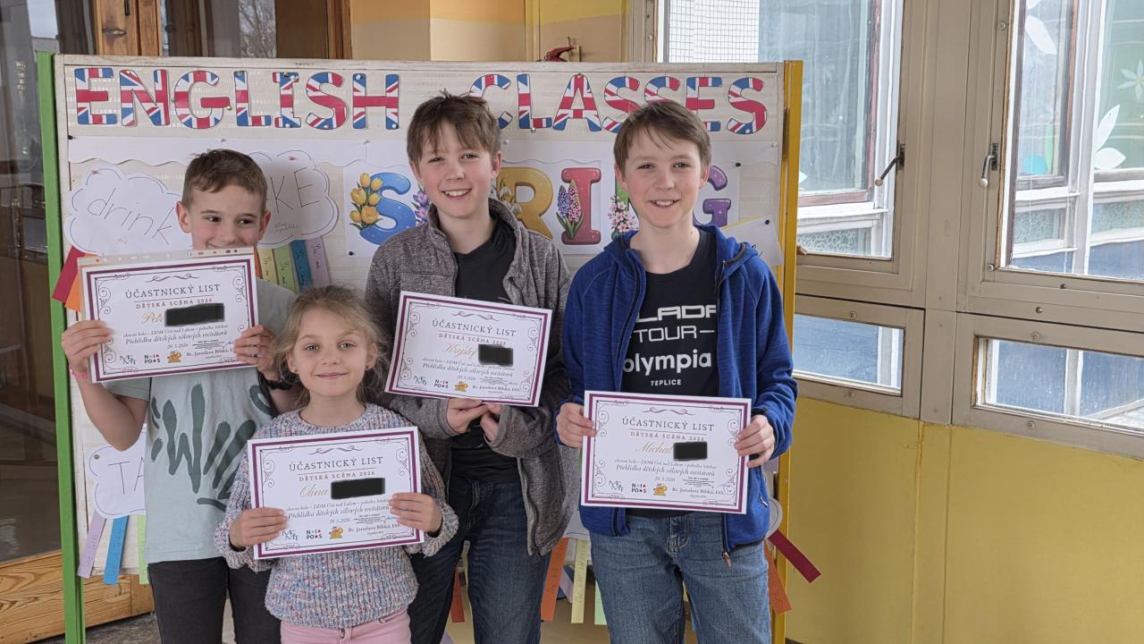 Žáci a žákyně soutěžili ve čtyřech kategoriích. V první a v druhé kategorii měla zastoupení i naše škola. Mezi nejmladšími soutěžícími si úspěšně vedli a naši školu reprezentovali Petr K. ze 3.C a Olinka Č. ze 2.C. V kategorii žáků 4. a 5. tříd naši školu reprezentovali Michal B. a Kryštof B. z 5.C. Chlapci stejně jako vloni velmi pěkně zarecitovali své básně. Zaslouží velkou pochvalu a věříme, že všichni čtyři zástupci naší školy si ze soutěže odnesli pěkné zážitky, v recitaci se budou ještě zdokonalovat a nám všem budou svými krásnými výkony i nadále dělat radost. Poděkování patří nejen všem čtyřem recitátorům, ale i jejich rodičům, kteří věnovali této soutěži svůj čas. Děkujeme a těšíme se na další spolupráci.