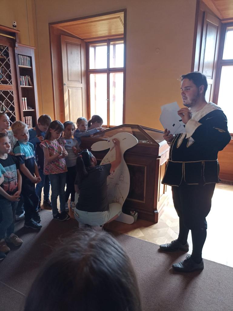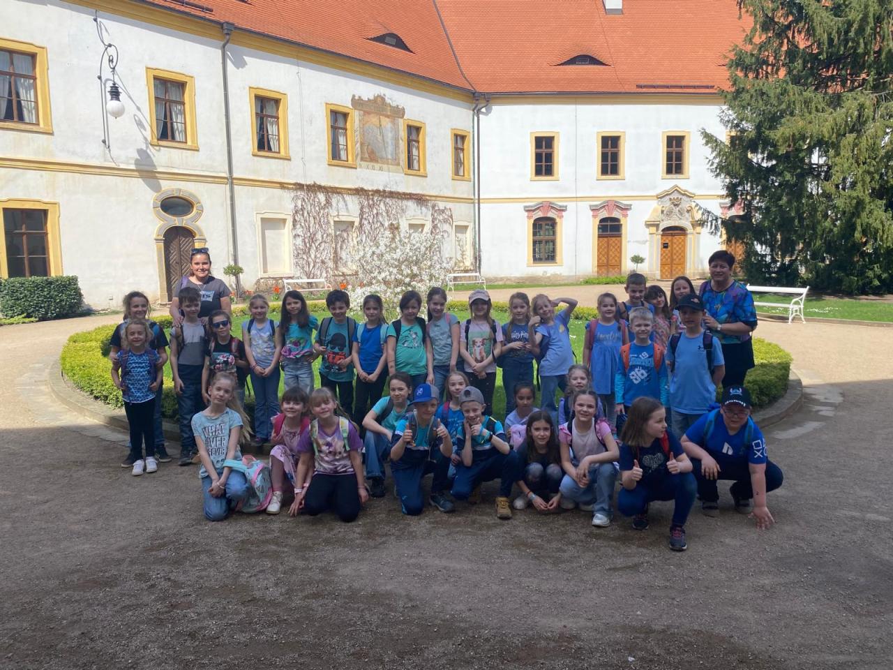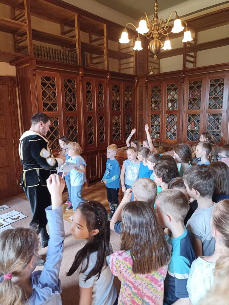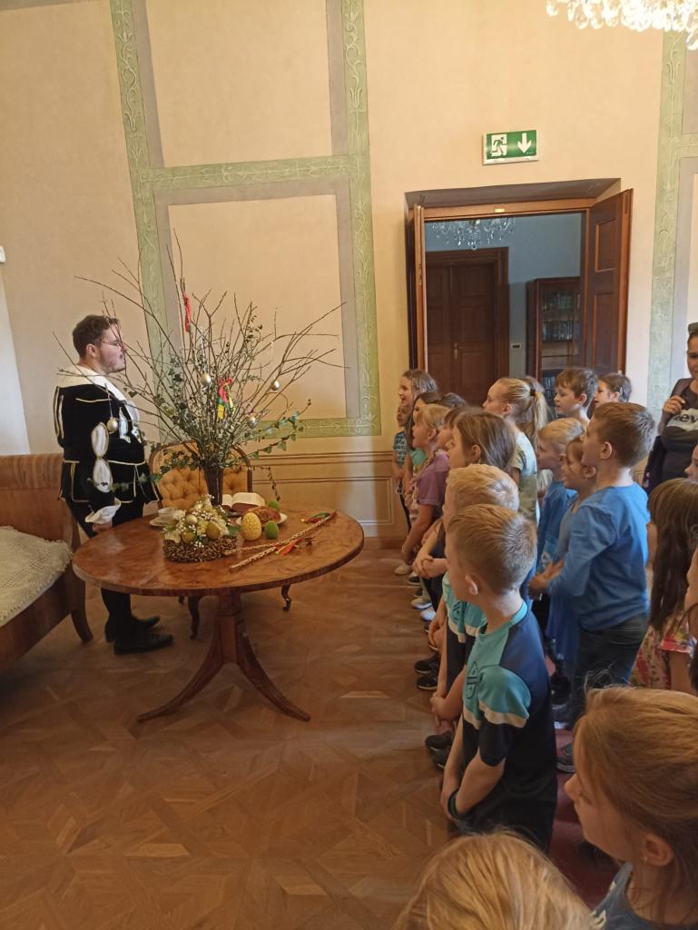 Ve středu 16.4. před velikonočními prázdninami se děti z 1. a 2. oddělení ŠD vydaly na odpolední výlet do Děčína na zámek. Program s názvem „Svátky jara na šlechtickém sídle“ byl připraven hravou, ale zároveň poučnou formou. Zámkem nás provázel komorník, který nám přiblížil různé aspekty zámeckého života. Komnaty nám otvírala panna klíčnice. Všichni pozorně poslouchali zajímavosti ze života šlechty a zároveň během prohlídky plnili různé úkoly – po komnatě hledali velikonoční vajíčka, skládali puzzle velikonoční kraslice, dávali dohromady zvířecí rodiny a společně přednesli velikonoční hodovačku. Kromě nákupu drobných suvenýrů, si každý odvezl ručně namalované velikonoční vajíčko nebo zápich. Užili jsme si krásné odpoledne a mohli se těšit na nadcházející Velikonoce.