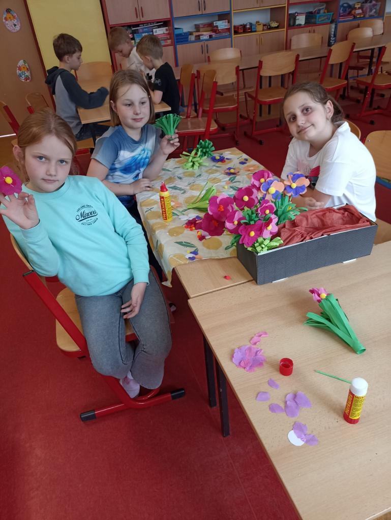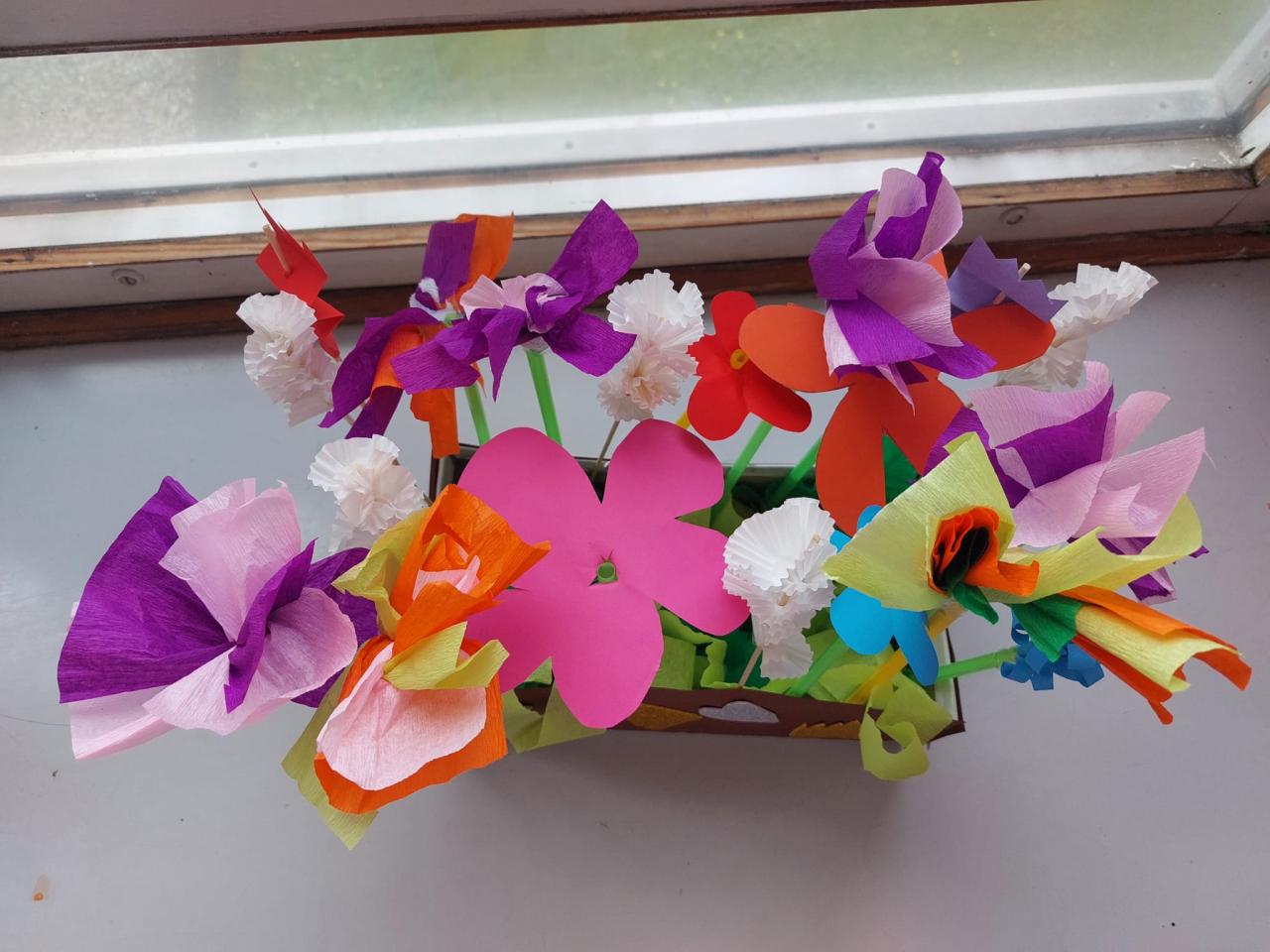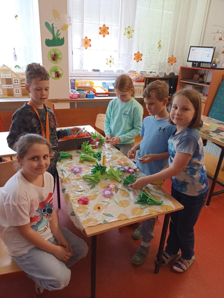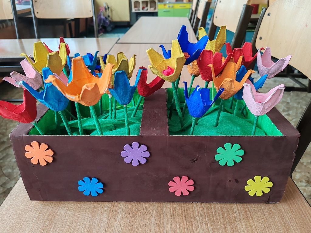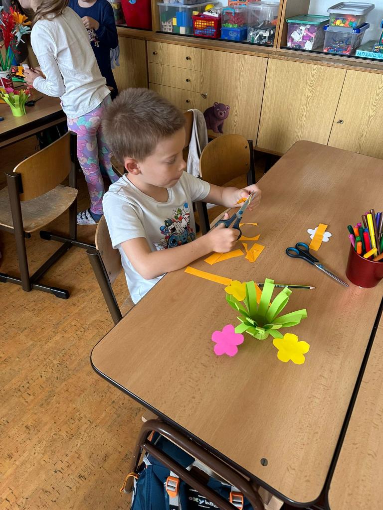 Další soutěží v naší školní družině byla tvorba květinových truhlíků za použití nejrůznějších materiálů. Někdo zvolil k výrobě barevný či krepový papír, ruličky od toaletního papíru, špejle či plata od vajíček. Výsledkem byly překrásné truhlíky a květináče s kytičkami různých tvarů i barev. Děti si daly s tvorbou květinové výzdoby opravdu hodně práce. Všechny výtvory jsme proto následně v prostorách školy vystavili, takže nám všem zpříjemňují každý den