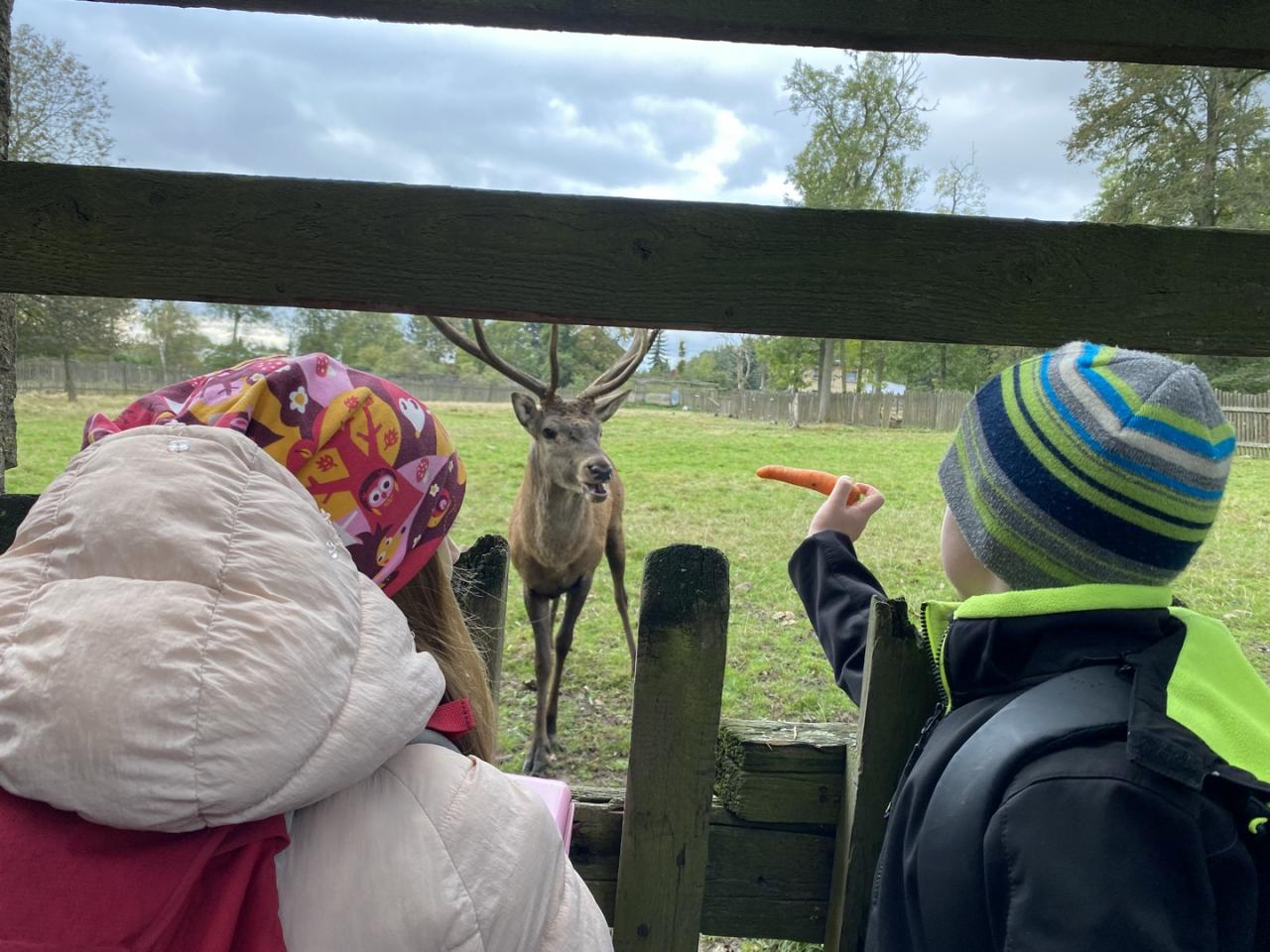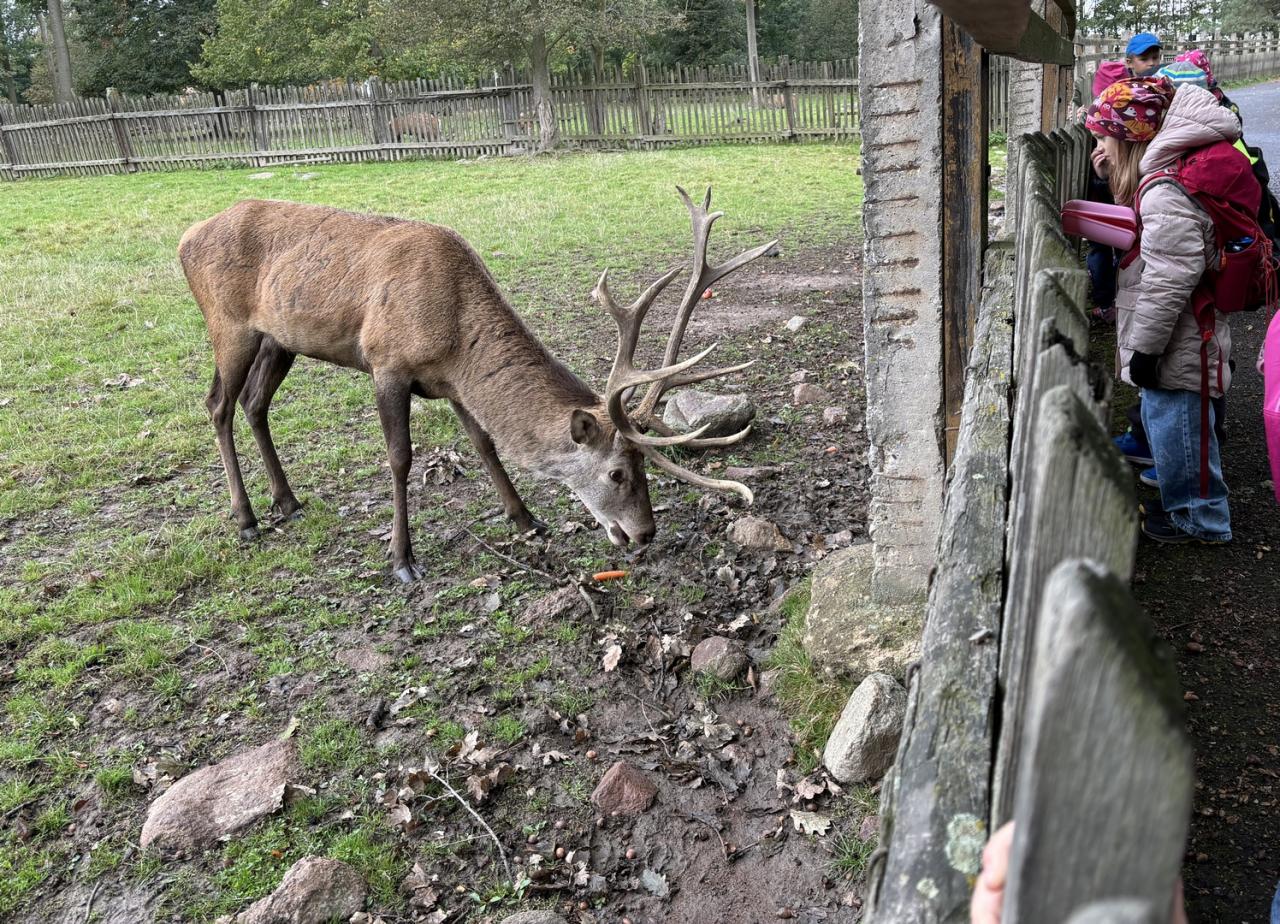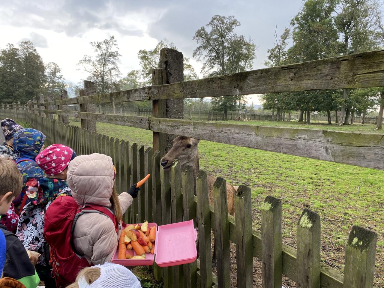 Zvířata zvyklá na lidi už čekala u plotu. Žáci tak mohli krmit a pozorovat jeleny, laně, divoká prasata, kozy, srnče, králíky, morčata, slepice, kachny a dovědět se informace o jejich životě.